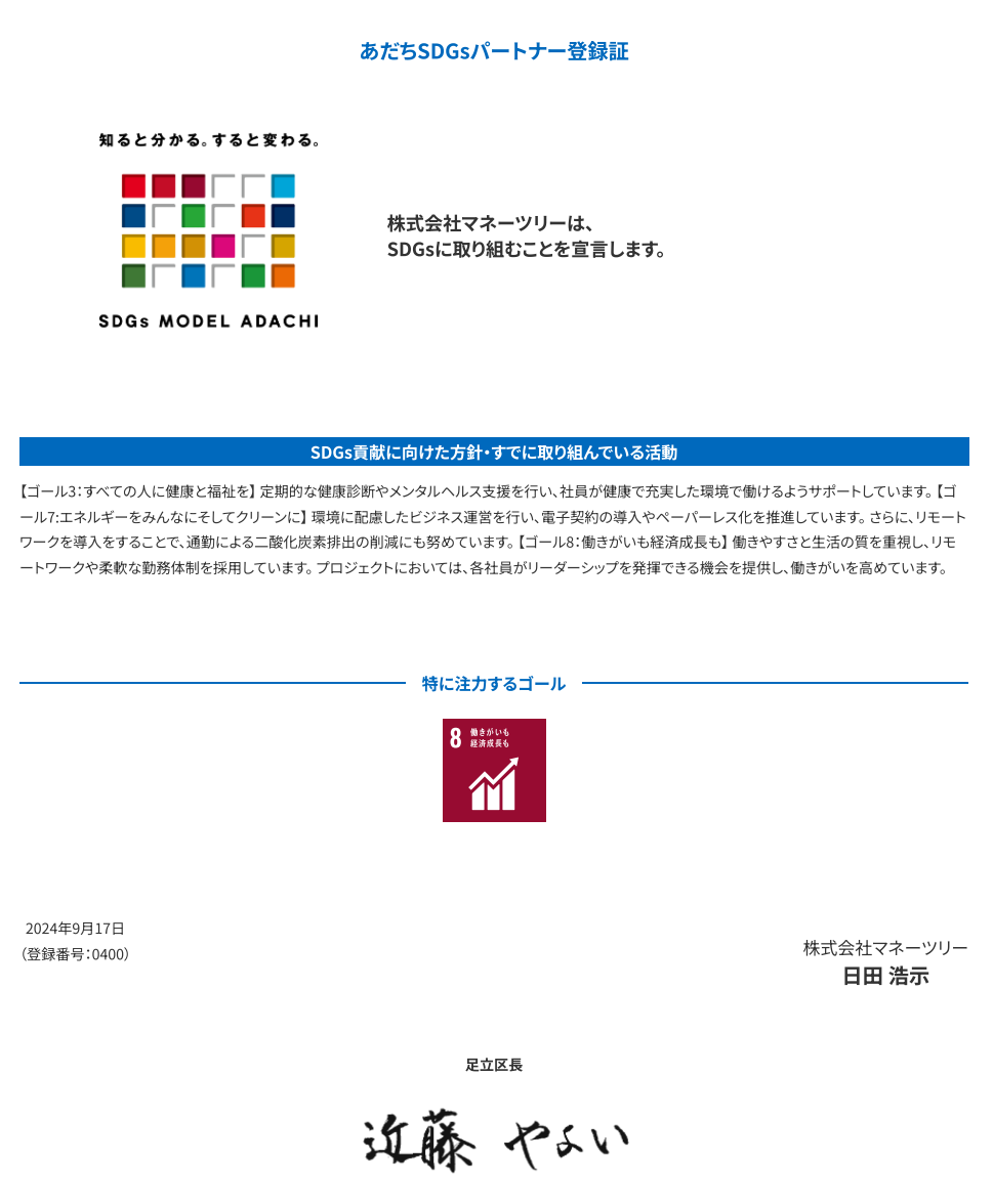当社は、あだちSDGs(https://www.adachi-sdgs.jp/)の持続可能なまちづくりに向けての取り組みに賛同し、あだちSDGsパートナーに登録しました。
